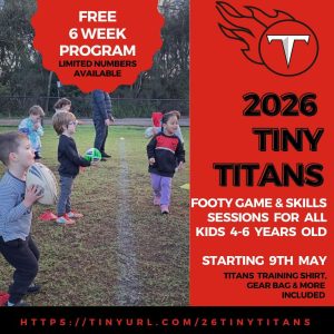 Our 2026 Tiny Titans Program starts Saturday May 9th. Every child gets a free goody bag, our new Training Shirt and becomes part of our great family club.